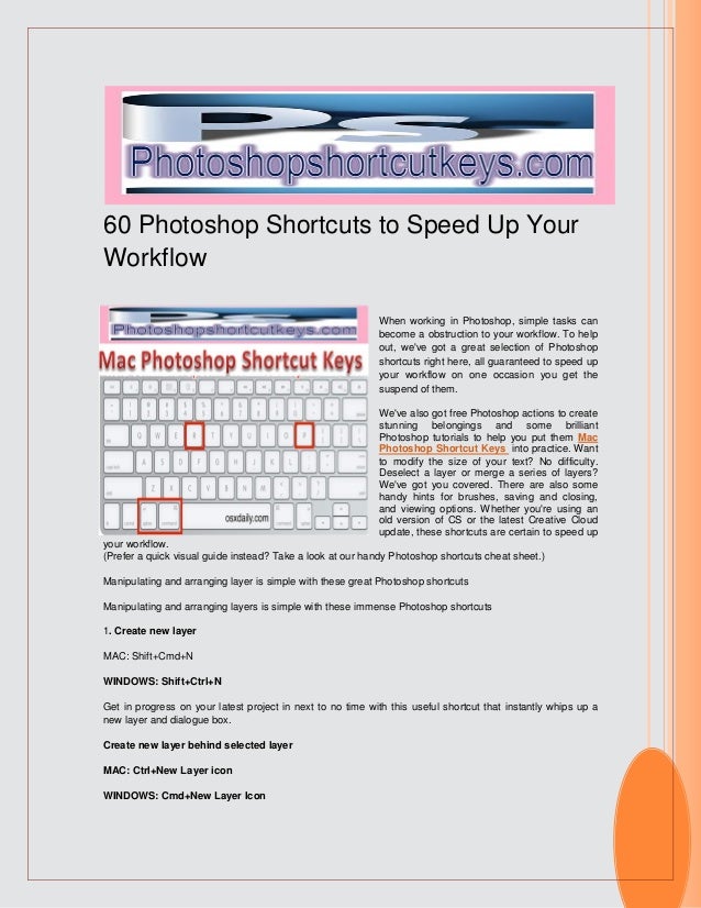 Photoshop mac shortcuts. Create new layer behind selected layer MAC:. Windows (45 KB) or Mac (45 KB) Keyboard Shortcuts Presets (October 31, 08). Launch Photoshop by clicking the Start menu or an icon on the taskbar (Windows) or clicking the Photoshop icon on the Dock (Mac).